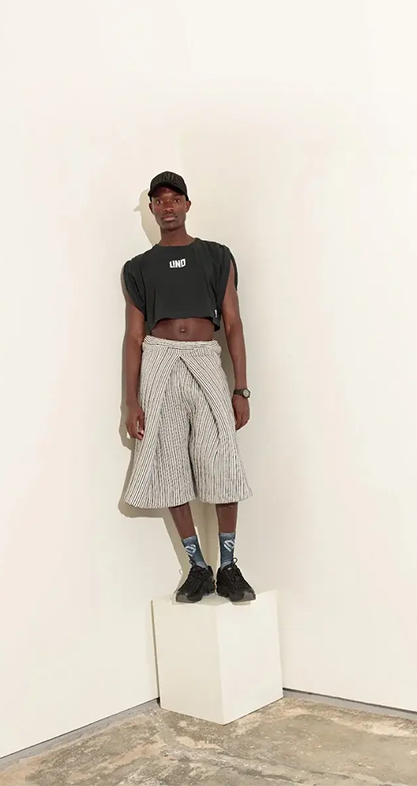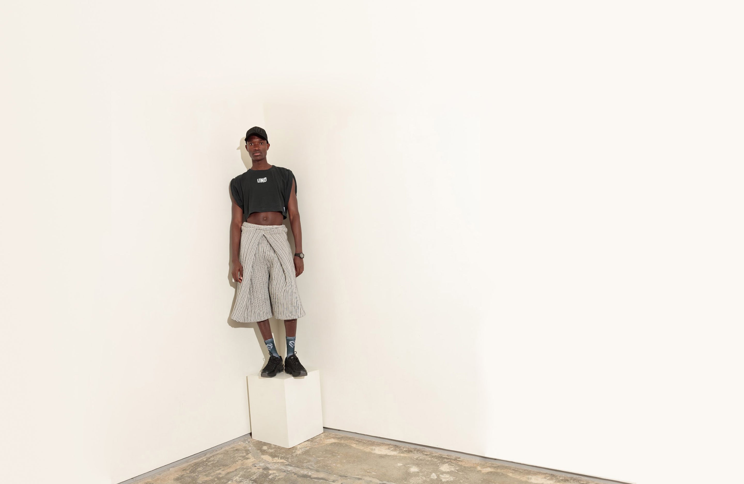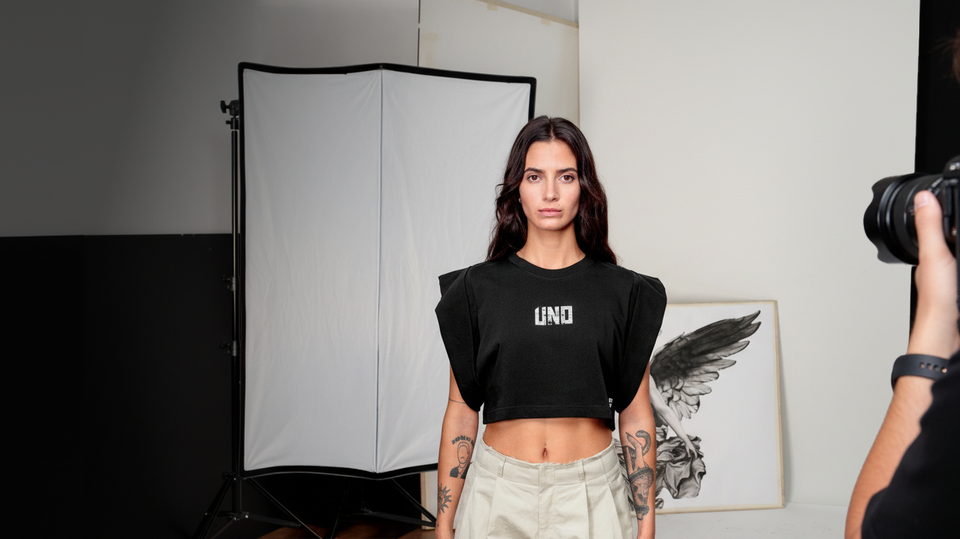 The UNO Crop Top is not an accessory within the artwork: it is part of the angel itself , integrated into the creative process like a second skin. Fashion and art cease to be two separate languages and become a single gesture.