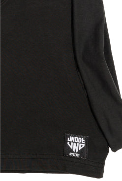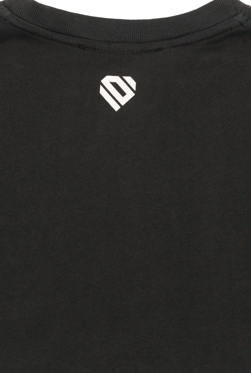 Oversized crop top with structured lines, anthracite color. Wide shoulders, round neck. Logo on the front. Printed l...