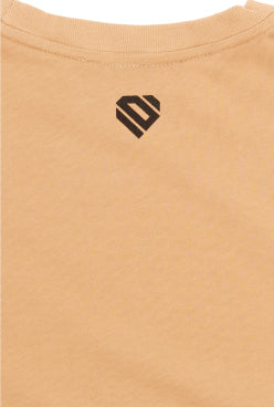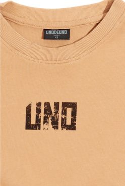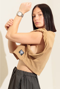 Oversized crop top with structured lines, camel color. Wide shoulders, round neck. Logo on the front. Printed logo o...