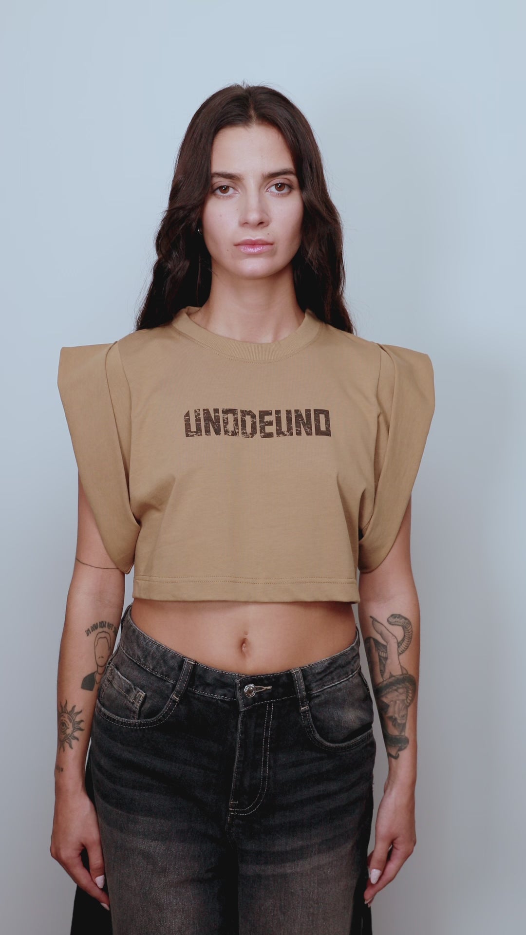 Oversized crop top with structured lines, camel color. Wide shoulders, round neck. Logo on the front. Printed logo on the back.